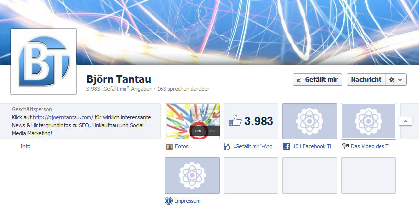 Diese Möglichkeit ist die von mir bevorzugte. Hierzu muss allerdings ein eigener Tab angelegt werden. Dazu ist es allerdings notwendig, sich mit dem Einrichten eines Tabs zu beschäftigen – oder es wird ein externer Dienstleister damit beauftragt. Ein Vorteil bei diesem Lösungsansatz ist hierbei definitiv, dass die Beschriftung individuell vorgenommen werden und der Linktext somit „Impressum“ lauten kann. In diesem erstellten Tab kann das komplette Impressum auf Facebook abgebildet werden. Allerdings hat auch diese Sache einen Haken: Ein wichtiger Platz in der Tab-Leiste geht verloren. Vom „Fotos“-Tab abgesehen, kann die Reihenfolge allerdings geändert werden. Wie das ganze live aussieht, kann auf der Unternehmensseite von Björn Tantau betrachtet werden.